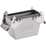 A metal cable coupler hood with M25 straight cable entry and two levers for fastening. Suitable for LAPP H-B 16 series connectors.