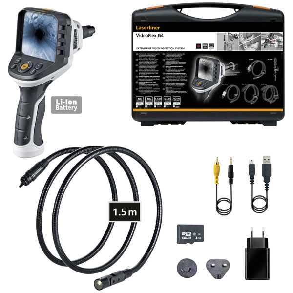 The Laserliner 082.247A endoscope features a 17 mm probe diameter and a 1.5 m probe length, ideal for confined space inspections. Manufactured by Laserliner, this gooseneck inspection camera is perfect for pipe examinations and detailed videoscopic analysis. The VideoFlex G4 Vario model is equipped for robust endoscopic inspections in various challenging environments.