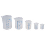 A set of five graduated beakers that feature wide mouths for easy measuring.