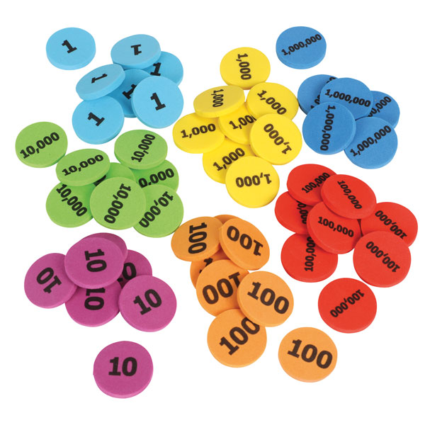 The discs are colour-coded into units, tens, hundreds, thousands, ten-thousands, hundred-thousands and millions for easy recognition. They are ideal for counting, addition and subtraction activities.