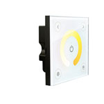 A glass fronted, wall mounted controller that provides colour temperature adjustment for white LED strips. This single zone wired controller provides On/Off, dimming, and a save function.