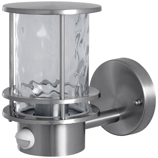 Product advantages: High flexibility in the choice of the illuminant thanks to the E27 socket. Suitable for smart applications thanks to compatibility with smart+ lamps from LEDVANCE. Easy and quick installation. Product features: Stainless steel housing. Diffuse from clear glass with hammer-stroke look. Available with and without motion sensor. Protection class: IP44 Available as wall and bollard lamps. Application areas: Outdoor application (only covered surfaces). Radiation from facades. Entrance lighting. Terraces, balconies. Road lighting. Approach slabs. Technical equipment: Complete mounting and connection accessories included. No bulbs included.
