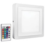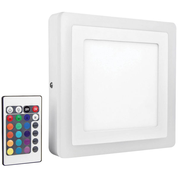 LED wall and ceiling light with remote control for white light and RGB colour control. Product features: 2 in 1 LED lamp for white and colour light. Available in round and square shape. Product advantages: Bright and uniformly warm-white illuminated light panel. Illumination of the housing frame with constant or automatic changing colour. Comfortable and intuitive remote control. Switch, dim in 5 steps and colour setting at the push of a button. Clear design, can be combined with different decorative styles. Application areas: Indoor applications. Mood lighting.