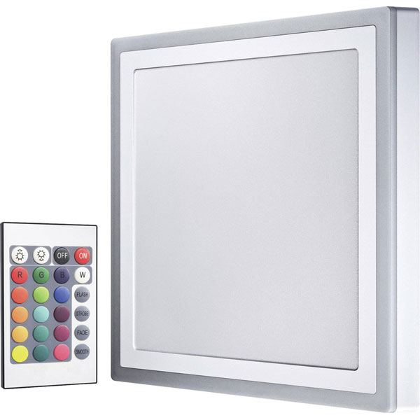 LED wall and ceiling light with remote control for white light and RGB colour control. Product features: 2 in 1 LED lamp for white and colour light. Available in round and square shape. Product advantages: Bright and uniformly warm-white illuminated light panel. Illumination of the housing frame with constant or automatic changing colour. Comfortable and intuitive remote control. Switch, dim in 5 steps and colour setting at the push of a button. Clear design, can be combined with different decorative styles. Application areas: Indoor applications. Mood lighting.