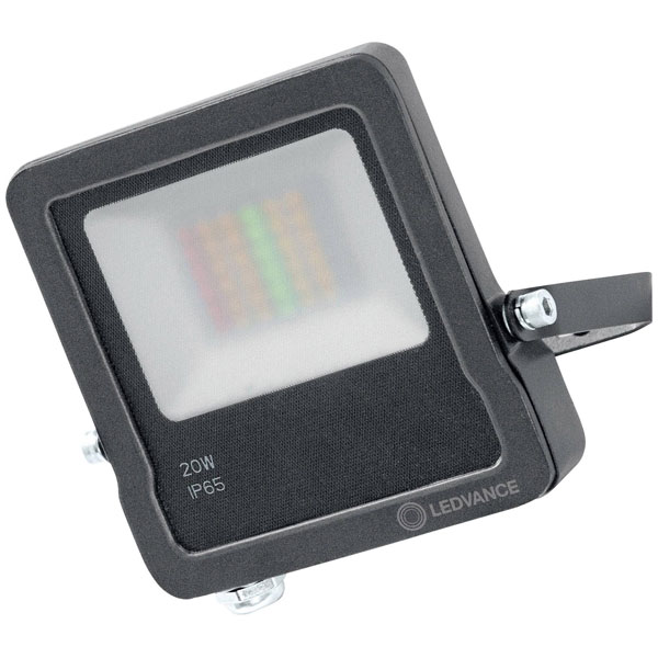 Floodlight with Wi-Fi technology. Product features: Control via LEDVANCE smart + app (Android 6.0 or higher). Control via Google Assistant or Amazon Alexa possible. RGB colour control, approx. 16 Mio colour options can be set. Dimmable. colour temperature: 3.000 K (warm white). Network protocol: WiFi. Mounting bracket with rotation range of up to 180°. {protection class} IP65. Connection by 0.5m cable, wiring necessary. Product advantages: Easy and fast installation. colourful garden lighting with smart controls. Combines the functionality of general lighting and mood lighting. Application areas: Radiation of facades. Technical equipment: Support bracket included. Including mounting screws and dowels. App or Voice Control requires compatible Smart Home System. Control via LEDVANCE smart + WiFi app requires a smartphone or tablet.