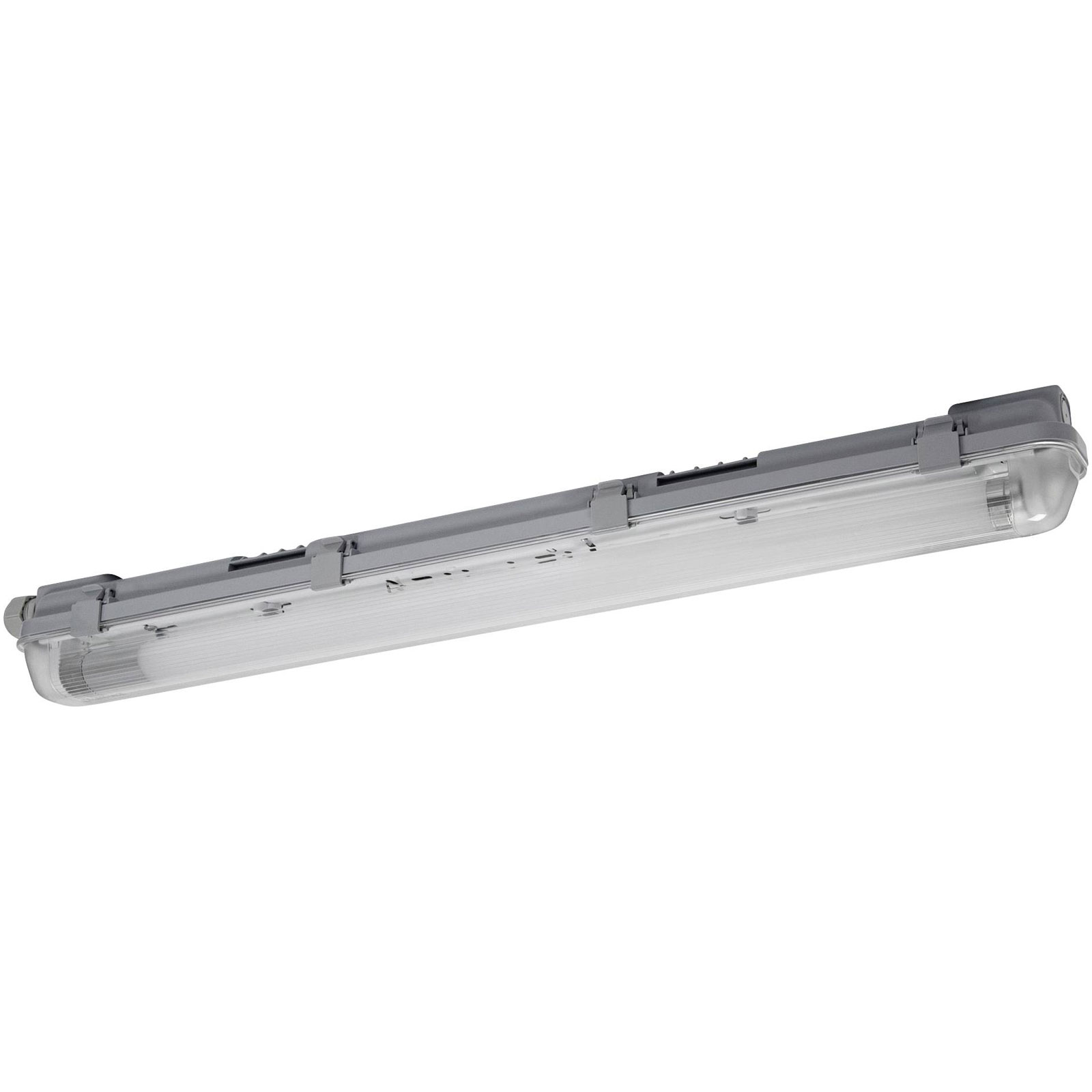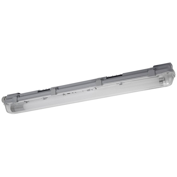 Wet room light with built-in motion detector. Product features: Durable and energy-saving LED light. Dust-proof and protected against water jets (IP65). Wet room light with infrared motion detector sensor integrated in the housing. Detection range: 100% Hold time: 3 minutes Default setting. Product advantages: Easy installation thanks to optimized space for mounting brackets and easy to open compartment. Easy lamp change. Good and even illumination. Enables additional energy savings and ease of use through sensor control. Areas of application: Cellars, garages, warehouses. For interior lighting only. Technical equipment: Motion detector integrated in the lamp housing. Works with every LED tube..