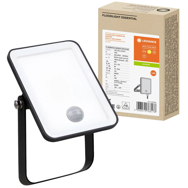 LEDVANCE Essentials 4058075768178 Floodlight Sensor! This 10W floodlight illuminates your space with a warm white glow at 3000K, creating a welcoming ambiance while enhancing visibility. Designed with a built-in motion sensor, it provides efficient, automatic lighting whenever you need it, making it ideal for outdoor areas like driveways, gardens, and entryways.
