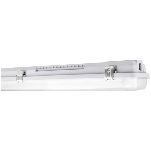 Wet room lights for T8 LED lamps with tool-free lamp terminals. Light housing, available for 1 or 2 T8 LED tubes. Suitable for LED TUBE T8 EM and LED TUBE T8 CONNECTED. {protection class} IP65. Integrated electrical fuse. Quick and easy installation. Pre-wired for easy installation of tubular AC LED lamps. Installation without any tools Rugged housing. A sustainable solution thanks to replaceable light sources. Garages, storage areas, production areas. Parking and underpasses. Garages. Technical equipment: Required accessories included. Feed-through wiring kit available.