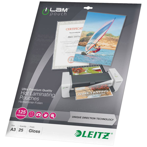 Leitz, with the Manufacturer's Part Number 7489, offers a high-quality laminating solution with its A3 125-micron glossy laminate sheets, packaged in quantities of 25. Recognised under the Alternative Description as Leitz Laminating film A3 UDT 125mic 25er and identified by the GTIN 04002432397730, these sheets are designed to provide robust document protection through a reliable laminating process. The product is ideal for use with a laminator, offering increased durability and preservation of various documents such as certificates, signage, and informational sheets. Engineers working in fields that require document protection, display, and presentation, such as construction, architecture, and education, may find these laminate sheets particularly beneficial for ensuring that important information remains legible and intact in challenging environments. The glossy finish is conducive to enhancing visibility and clarity, while the self-sealing feature simplifies the lamination process.