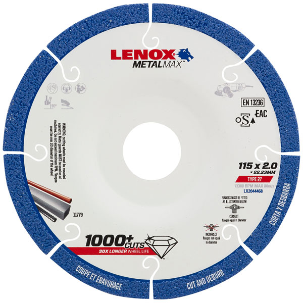 The LENOX METALMAX™ Diamond Blade made for extreme durability and maximum work efficiency. Generates less odor and dust residue as the wheel does not wear down like bonded abrasives. Visible sparks originate only from the material being cut.