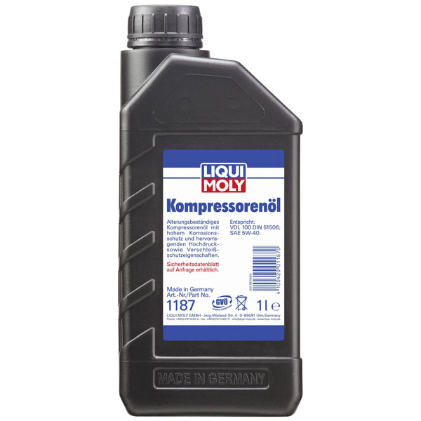 Liqui Moly manufactures the 1187 Compressor Oil, a high-quality lubricant designed for compressors. This oil provides excellent protection and performance, ensuring optimal function and longevity of machinery. It is ideal for use in various industrial compressors, ensuring reliability and efficiency.