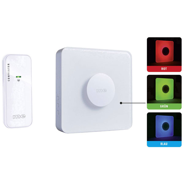 The m-e modern-electronics wireless door chime complete set with a backlit feature. It is ideal for residential applications, offering convenience and modern design. This wireless doorbell is easy to install and enhances any home's entryway with its sleek appearance.