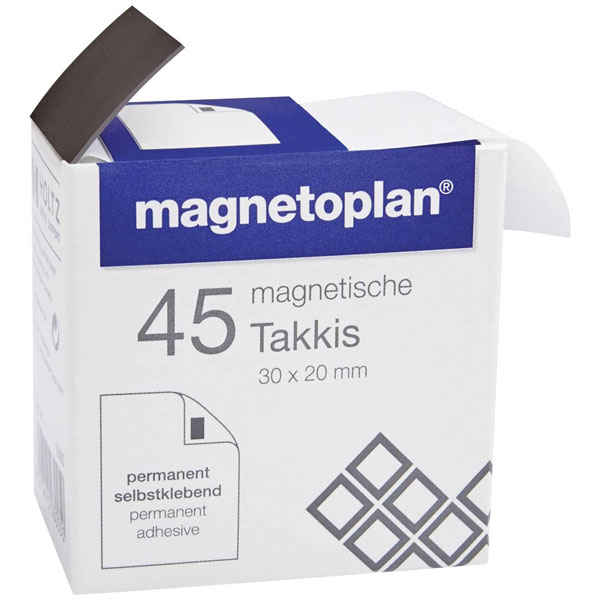 Magnetoplan 15503 is a magnetic tape set comprised of 45 pieces, each with dimensions of 20 mm by 30 mm and a thickness of 0.75 mm, in a rectangular shape. This product is designed for versatile, non-permanent attachment applications in engineering and design environments, where the precise positioning of components is required. With its robust magnetic adhesion, this tape is suitable for securely fixing lightweight items to metallic surfaces, making it ideal for prototype development, temporary signage placement, and layout adjustments in technical projects. Magnetoplan's offering is engineered for reliable performance, ensuring that components remain in place while accommodating quick repositioning or removal as needed.