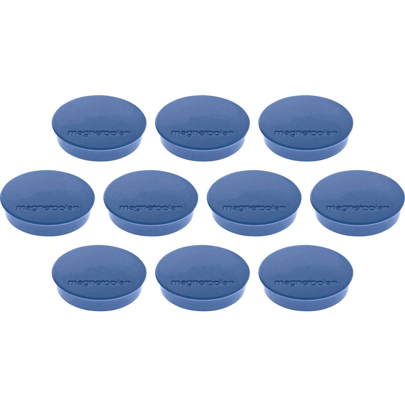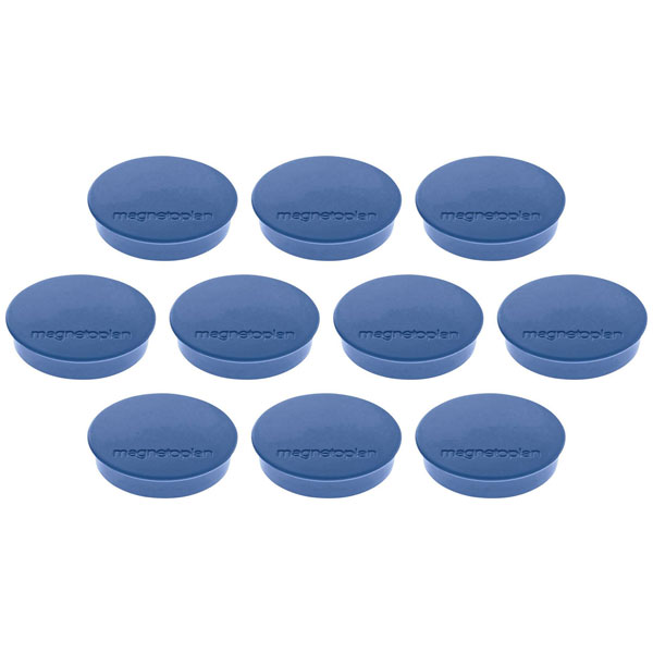 Magnetoplan 1664214 is the Discofix Standard magnetic clamps, designed as power magnets for secure attachment. Each magnet measures 30x8 mm and comes in a round, dark blue form, provided in a set of ten pieces. These magnets utilise powerful magnetic force, making them suitable for applications where reliable holding capability is required, including industrial settings, office environments, and educational contexts, particularly for holding documents or materials on magnetic surfaces. Engineered for durability, they support precise alignment and strong fixation on metal boards or other ferromagnetic foundations. With their robust construction, these magnets are well-suited for tasks demanding repetitive use and dependable performance.