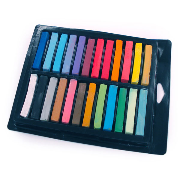 Soft pastels in 24 assorted colours. 1cm square cross-section allows for a variety of marks to be made, and reduces breakages from pastels rolling off tables. Length approx. 6cm.