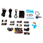 Supplied with 1 x 9g micro servo, 1 x red 7-segment display, 1 x Orion, 1 x joystick, 1 x ultrasonic sensor, 1 x potentiometer , 1 x light and greyscale sensor, 1 x RJ25 adaptor, 1 x PIR motion sensor, 4 x 6P6C RJ25 cable 20cm, 1 x sound sensor, 2x 6P6C RJ25 cable 35cm, 1 x 6P6C RJ25 cable 50cm, 1 x temperature Sensor, 1 x 130 DC motor pack, 1 x USB 2.0 A-male to micro B-male cable, 1 x Bluetooth module (dual mode), 1 x battery holder (6 x AA, not supplied), 1 x RGB LED.
