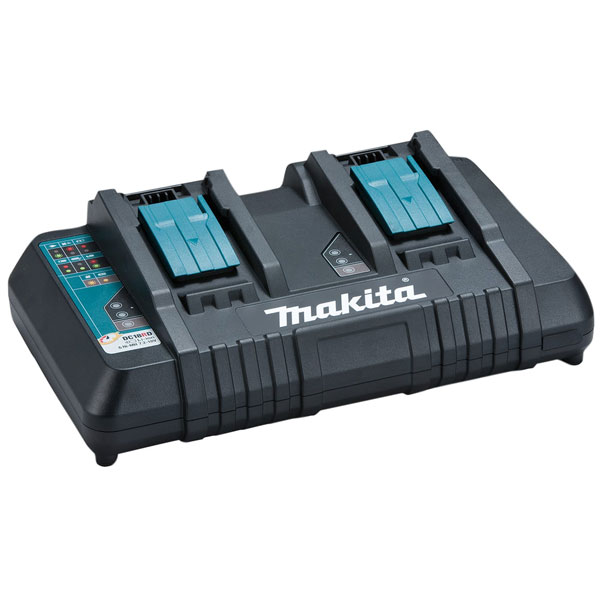 The Makita DC18RD Twin Port Charger is able to charge two Makita slide style Li-ion and Ni-MH batteries (with adapter) at the same time, this is as fast as the DC18RC charges one battery.