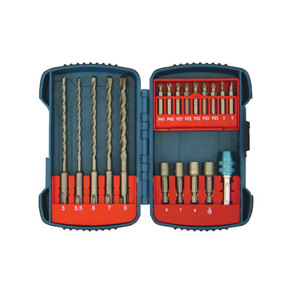 Invaluable 19-piece Makita drill and driver set designed for use with SDS+ hammer drills. Set includes 5 of the most useful SDS+ hammer masonry drill bits, along with 9 screwdriver bits and 4 nut runners, together with SDS+ shank.