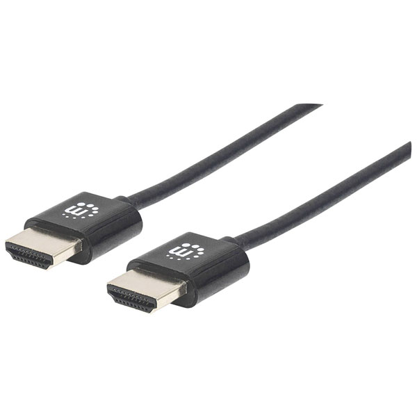 Manhattan 394406 is a 0.50 metre HDMI cable featuring HDMI-A to HDMI-A connectors, designed for high-definition audio and visual applications with support for 4K UHD resolution. This ultra-thin cable, coloured black, incorporates an Ethernet channel and an Audio Return Channel, enabling streamlined connectivity between devices such as monitors, screens, and display units. Its compact design makes it suitable for engineering environments where space constraints are a concern, while still maintaining full functionality required for high-quality visual displays and sound transmission. This cable is ideal for use in professional settings that demand reliable and efficient multimedia data transfer.