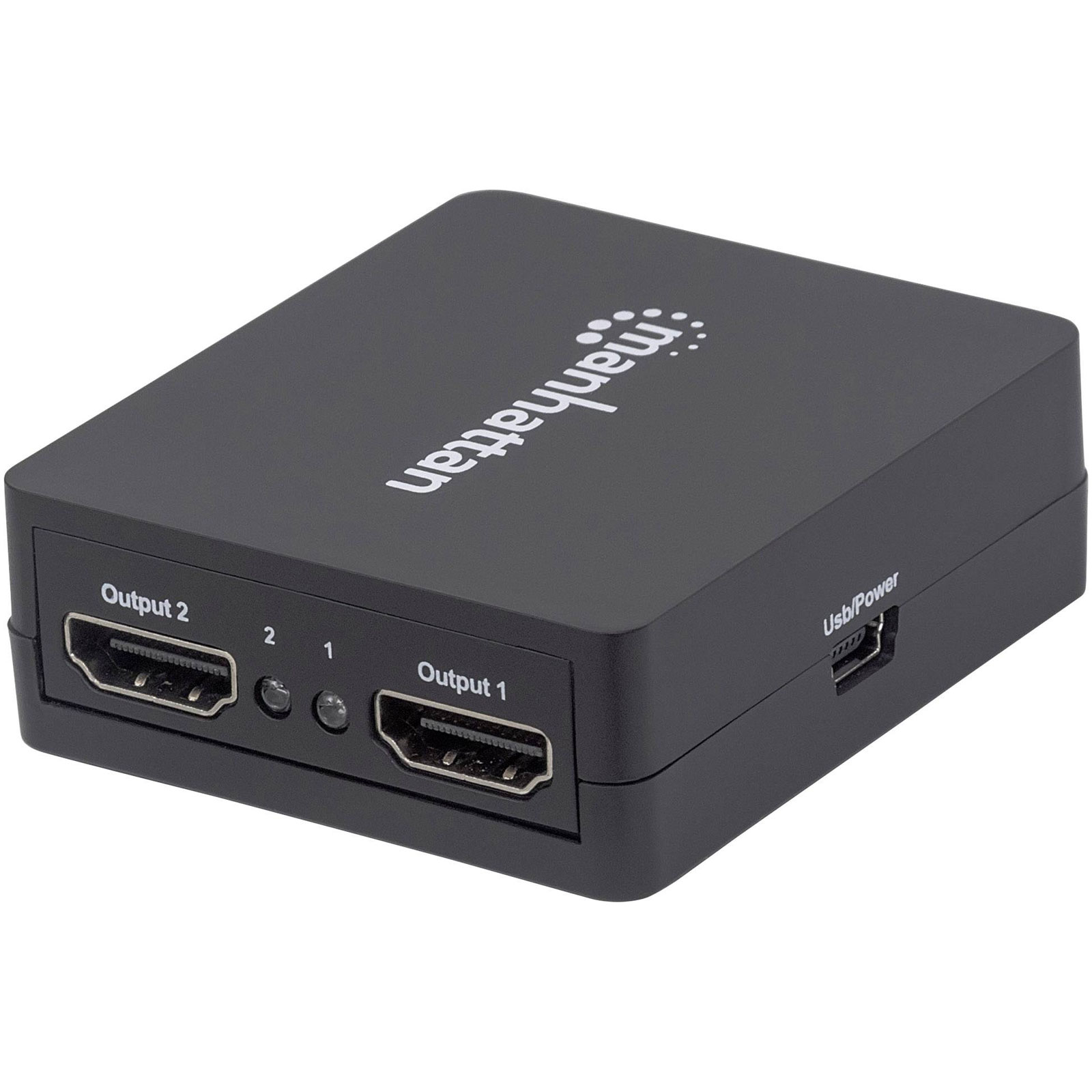 Manhattan produces a range of black HDMI splitters that offer varying resolutions, including high definition and ultra high definition, some equipped with LED indicators.
