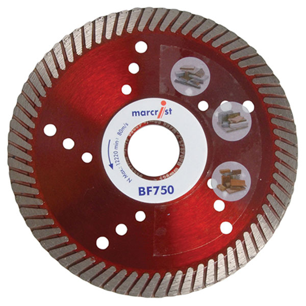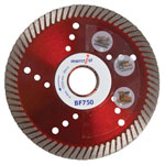 The BF750 Series Diamond blades have a 10.5 mm Diamond rim for speed, precision and for long life. Can be used wet or dry and with hand-held or stationary machines.