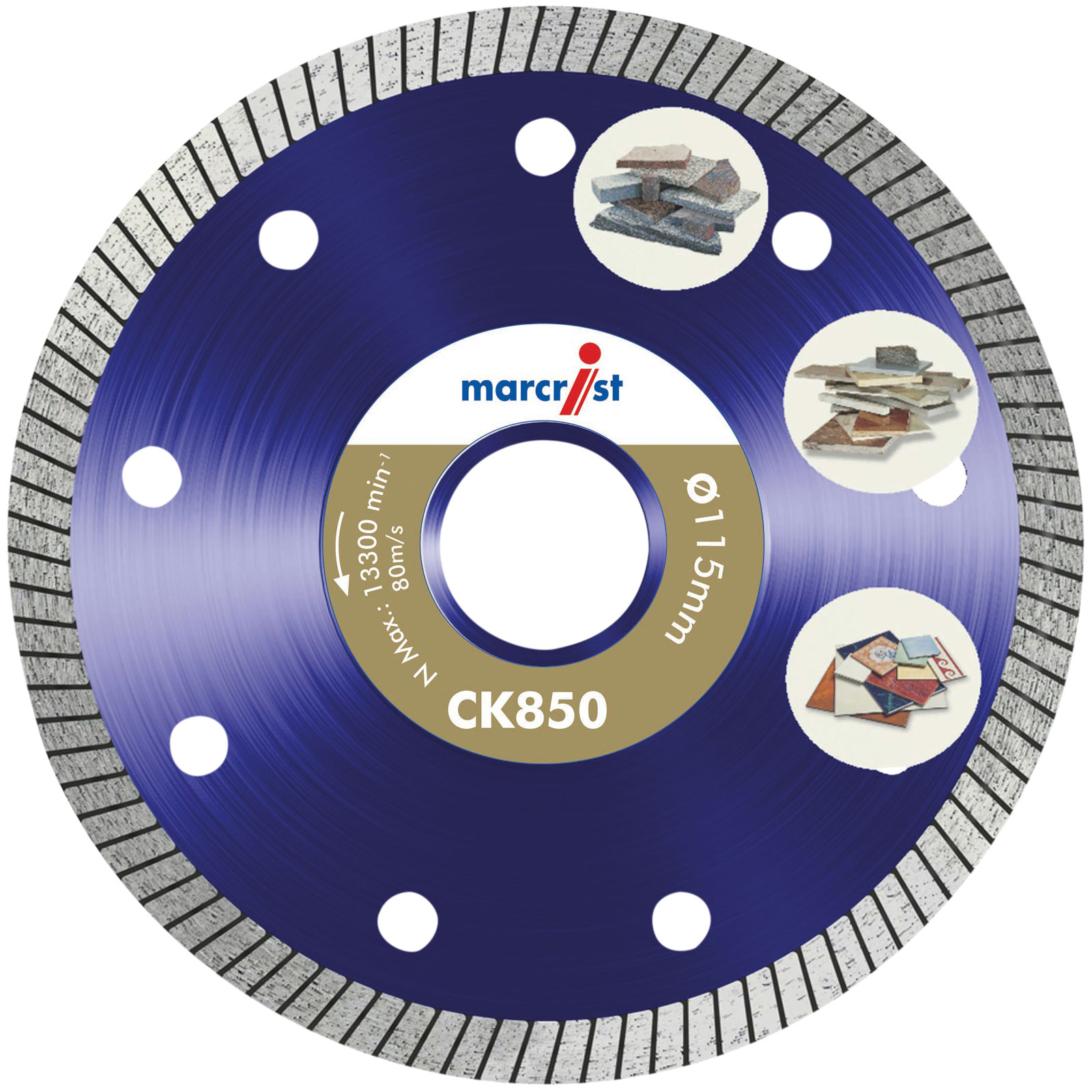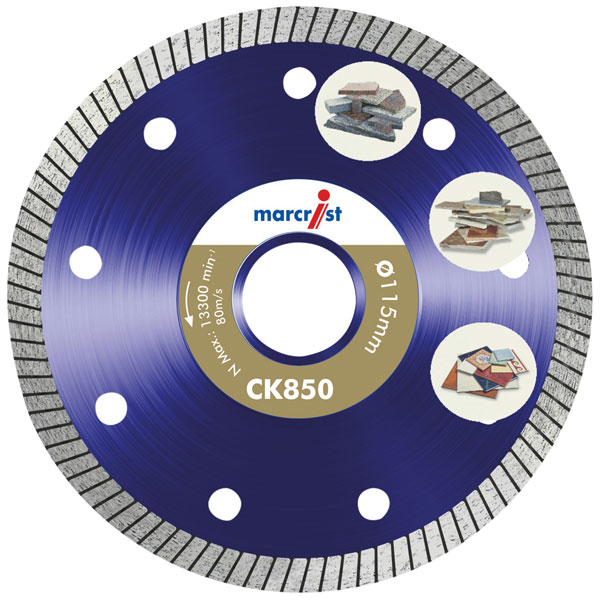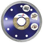 The CK850 Series Diamond Tile blades use Real Natural Diamonds and have a 1.2 mm Diamond rim for extreme speed, ultra precise cut and for long life. Can be used wet or dry and with hand held machines.
