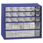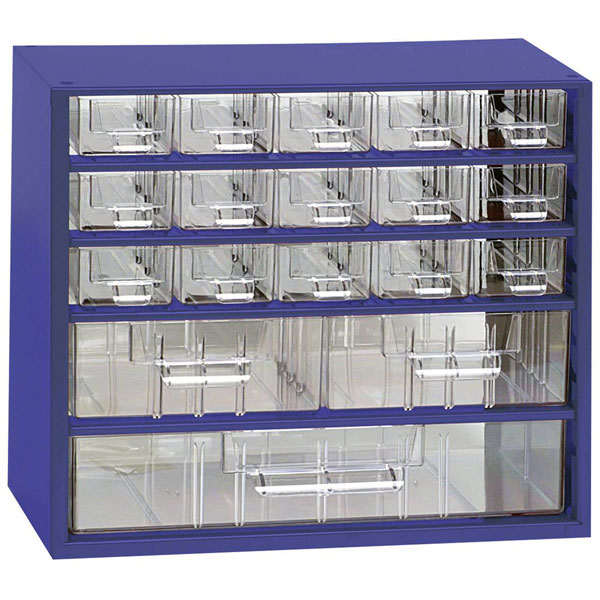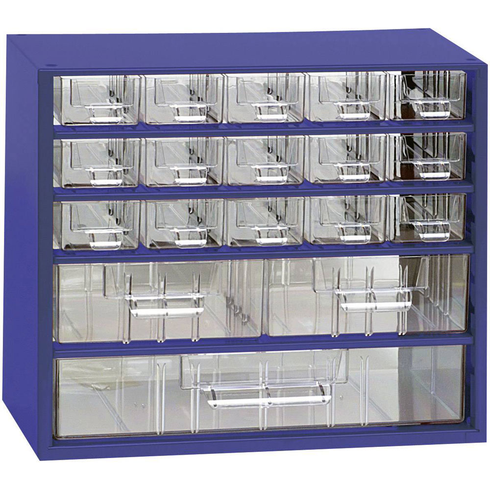 The MARS Svratka workshop depot is a storage rack for small parts featuring 18 fixed compartments, measuring 307 x 155 x 284 mm. Made with a metal frame and designed as an organiser box, it is ideal for storing and sorting components and accessories in workshops. This blue component container is suitable for managing active components and comes with an EAN of 4016138567878.