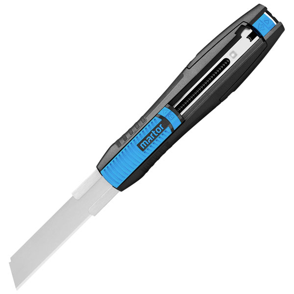 Martor 38000102 is a premium quality safety cutter specifically designed for precision and reliability. This cutter features an 18mm blade encased within a robust band steel structure, providing a balance of strength and durability while maintaining a lightweight form. The design incorporates a distinctive black and cyan colour scheme, enhancing visibility and distinctiveness, which is critical in fast-paced working environments. Often utilised in industries requiring precise cutting with enhanced safety measures, such as packaging, warehousing, and manufacturing, this cutter allows for efficient handling of materials like polystyrene and various packaging foils. Its safety-oriented design reduces the risk of accidents, making it suitable for environments adhering to strict safety standards.