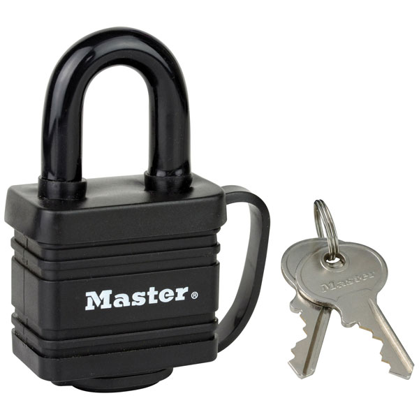 The Masterlock Weather Tough® Padlocks have a laminated steel body with the addition of complete body protection from the elements. The high tech thermoplastic cover keeps the entire padlock, including the shackle, protected from the elements. The additional quick snap-on cap protects the lock mechanism from weather, dust, dirt and sand, helping to maintain the mechanism for longer.