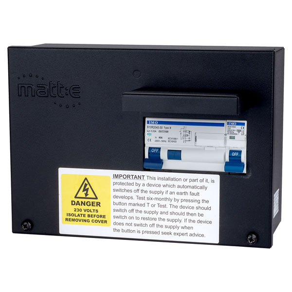 The unit incorporates matt:e's unique monitoring device, which disconnects all poles including CPC in the event of a fault, plus a built-in double-pole Type B RCD and 32A MCB.