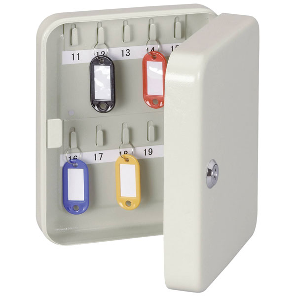 The Maul Key Cabinet 20900 is a sturdy key holder featuring 40 hooks, making it ideal for organised key safe keeping. It is an anti-theft device, designed for secure storage of key fobs and key rings. This grey key cabinet is commonly used in offices, schools, and other facilities requiring efficient key management.