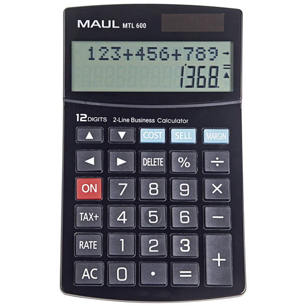 Maul 7269090 corresponds to the MTL 600 desk calculator, which features a robust design suitable for both battery-powered and solar-powered operation, enhancing its versatility in various environments. The calculator displays up to 12 digits, making it ideal for tasks requiring precise arithmetic operations, common in engineering applications such as complex data analysis and statistical computation. Its black casing provides a professional aesthetic, while ensuring durability and reliability for everyday use by professionals who require consistent and accurate performance in tasks like financial modelling, scientific calculations, and general numerical data processing. The dual power supply system ensures the calculator remains operational in varying lighting conditions, thus supporting continuous project workflows without power interruptions.