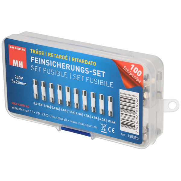 The Max Hauri Micro fuse set contains 100 cartridge fuses with time delay, each measuring 5 mm x 20 mm. These glass fuses are ideal for protecting electrical circuits by preventing overcurrent situations. Widely used in household appliances and various electronics, they ensure reliable performance and safety.
