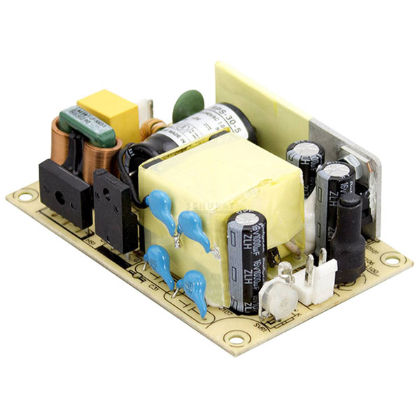 The Mean Well RPS-30-12 is a switch mode power supply unit (SMPSU) designed for mounting on printed circuit boards. It provides a 12 V DC output with a current rating of 2.5 A for a total power of 30 W, and includes solder lugs for secure connections. Typical applications include use in industrial equipment and electronic devices requiring efficient power conversion.