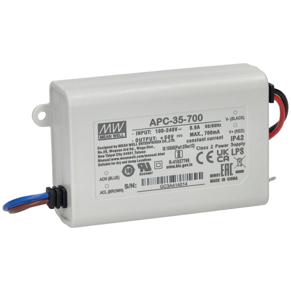 MeanWell APC-35-700 35watt Constant Current LED Driver - Constant current LED Drivers can fluctuate output voltage to maintain a set current and are generally used for applications using LED downlights and strings of LED's wired in series.
