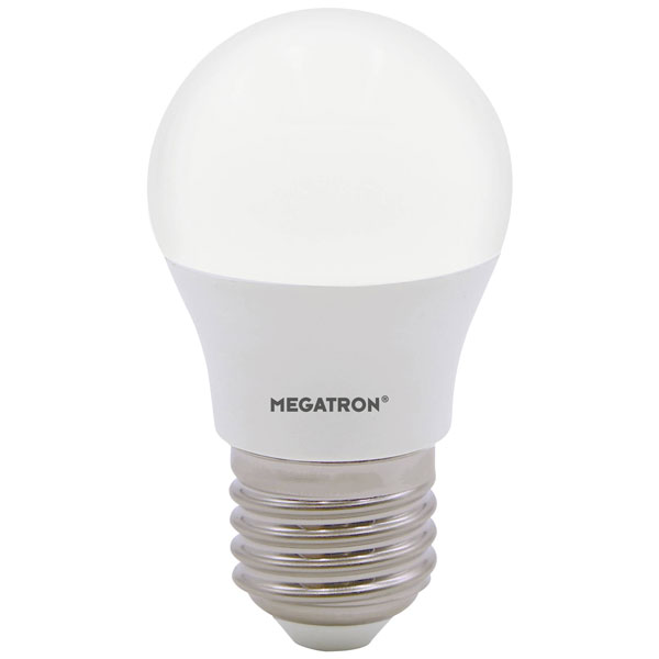 The Megatron MT65004 LED (monochrome) light bulb features a teardrop shape and provides 5.5 W of neutral white light. It measures 45 mm in diameter and 78 mm in length, fitting into an E-27 socket. Ideal for residential and commercial lighting, this energy-efficient bulb offers a modern lighting solution.