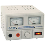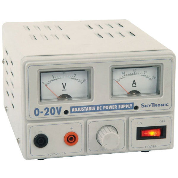 This regulated power supply has variable output voltages from 0 to 20V with a max current of 2A. The power supply is fitted with 2 panel meters for analogue display of voltage and current.