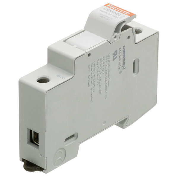 This DIN Rail mounting fuseholder in single pole configuration from Mersen accommodates 10 x 38mm industrial fuses.