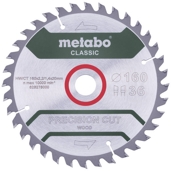 The Metabo Precision Cut Wood Classic circular saw blade, model 628278000, features 36 cogs and measures 160 x 20 x 1.4 mm. This high-quality saw blade is designed for precise wood cutting, ensuring smooth and accurate results. It is typically used in construction, carpentry, and woodworking for efficient and clean cuts.