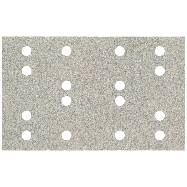 Metabo adhesive sanding sheets measure 80 x 133 mm and come in a pack of ten with a P40 grit and 16-hole design. These sheets feature Velcro-type adhesion for easy attachment to compatible power tools. They are ideal for heavy-duty sanding applications, offering efficient material removal on wood and metal surfaces.
