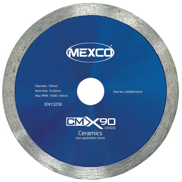 The MEXCO X90 Grade Ceramic Materials Diamond Blade has been developed with a continuous rim segment to cut ceramic tiles quickly and cleanly. The performance of this product can be attributed to its high diamond concentration allowing a large amount of diamond grit to be exposed at all times producing a fast accurate clean cut.