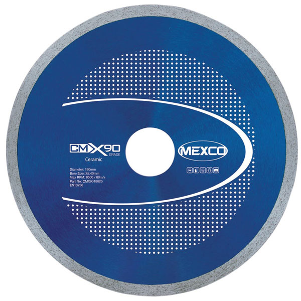 The MEXCO X90 Grade Ceramic Materials Diamond Blade has been developed with a continuous rim segment to cut ceramic tiles quickly and cleanly. The performance of this product can be attributed to its high diamond concentration allowing a large amount of diamond grit to be exposed at all times producing a fast accurate clean cut.