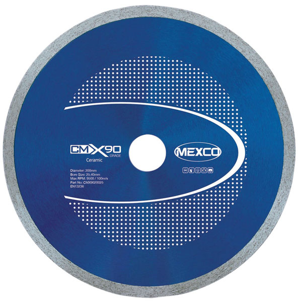 The MEXCO X90 Grade Ceramic Materials Diamond Blade has been developed with a continuous rim segment to cut ceramic tiles quickly and cleanly. The performance of this product can be attributed to its high diamond concentration allowing a large amount of diamond grit to be exposed at all times producing a fast accurate clean cut.