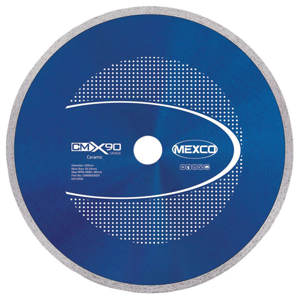 The MEXCO X90 Grade Ceramic Materials Diamond Blade has been developed with a continuous rim segment to cut ceramic tiles quickly and cleanly. The performance of this product can be attributed to its high diamond concentration allowing a large amount of diamond grit to be exposed at all times producing a fast accurate clean cut.
