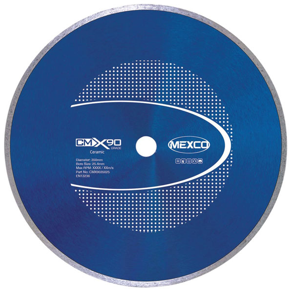 The MEXCO X90 Grade Ceramic Materials Diamond Blade has been developed with a continuous rim segment to cut ceramic tiles quickly and cleanly. The performance of this product can be attributed to its high diamond concentration allowing a large amount of diamond grit to be exposed at all times producing a fast accurate clean cut.