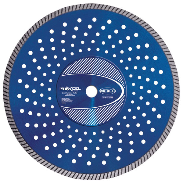 The MEXCO XCEL Grade Dual Purpose Turbo Diamond Blade. Specifically designed for fast cutting a wide range of hard and non-abrasive building products. It’s rapid cool centre and turbo fast cut segment delivers the ultimate cut at a fast speed.
