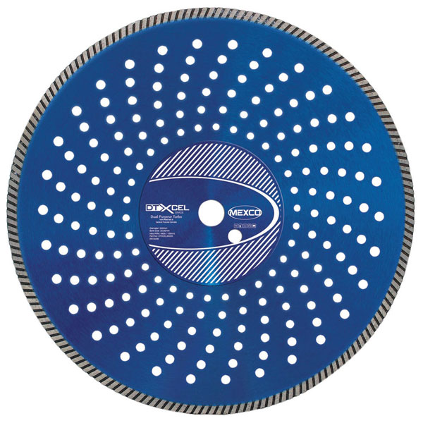 The MEXCO XCEL Grade Dual Purpose Turbo Diamond Blade. Specifically designed for fast cutting a wide range of hard and non-abrasive building products. It’s rapid cool centre and turbo fast cut segment delivers the ultimate cut at a fast speed.