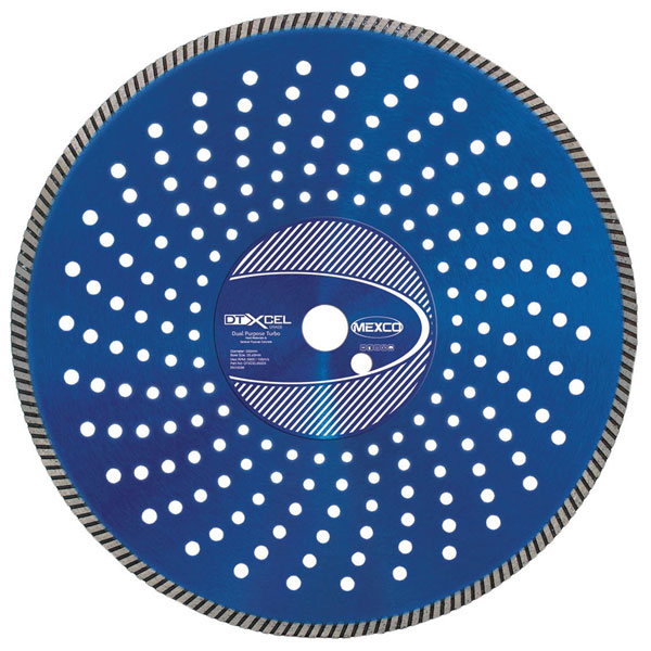 The MEXCO XCEL Grade Dual Purpose Turbo Diamond Blade. Specifically designed for fast cutting a wide range of hard and non-abrasive building products. It’s rapid cool centre and turbo fast cut segment delivers the ultimate cut at a fast speed.