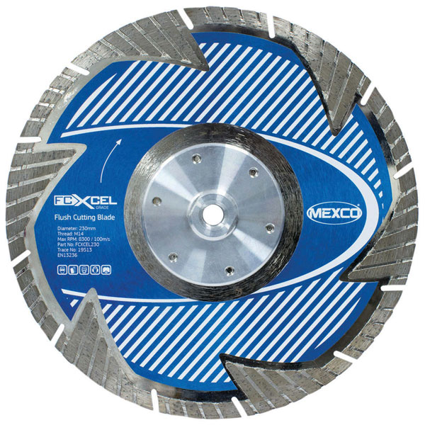 The MEXCO FCXCEL Grade Flush Cut Diamond Blade is designed to be used on angle grinders for both straight and flush cutting. These blades are fitted with a detachable flange mount with an M14 thread attaching directly to most angle grinders. The flush face gives the opportunity for deep cutting and flat finishing.