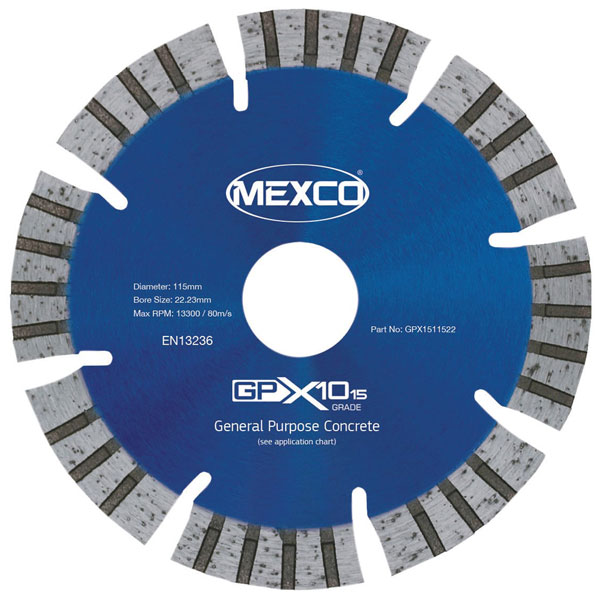 MEXCO GPX10-15 Concrete Diamond Blades have been specifically designed for cutting a wide range of general purpose building materials. The GPX10-15 offers a cost effective solution for the user who requires a diamond blade which can cope with the cutting of the most widely used non-abrasive building materials.